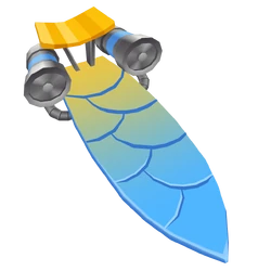 This is a fish-shaped board with a spoiler on the back. It is painted yellow and sky blue. The blue color forms fish scales. The Super Speed upgrade adds two grey fans to each side.
