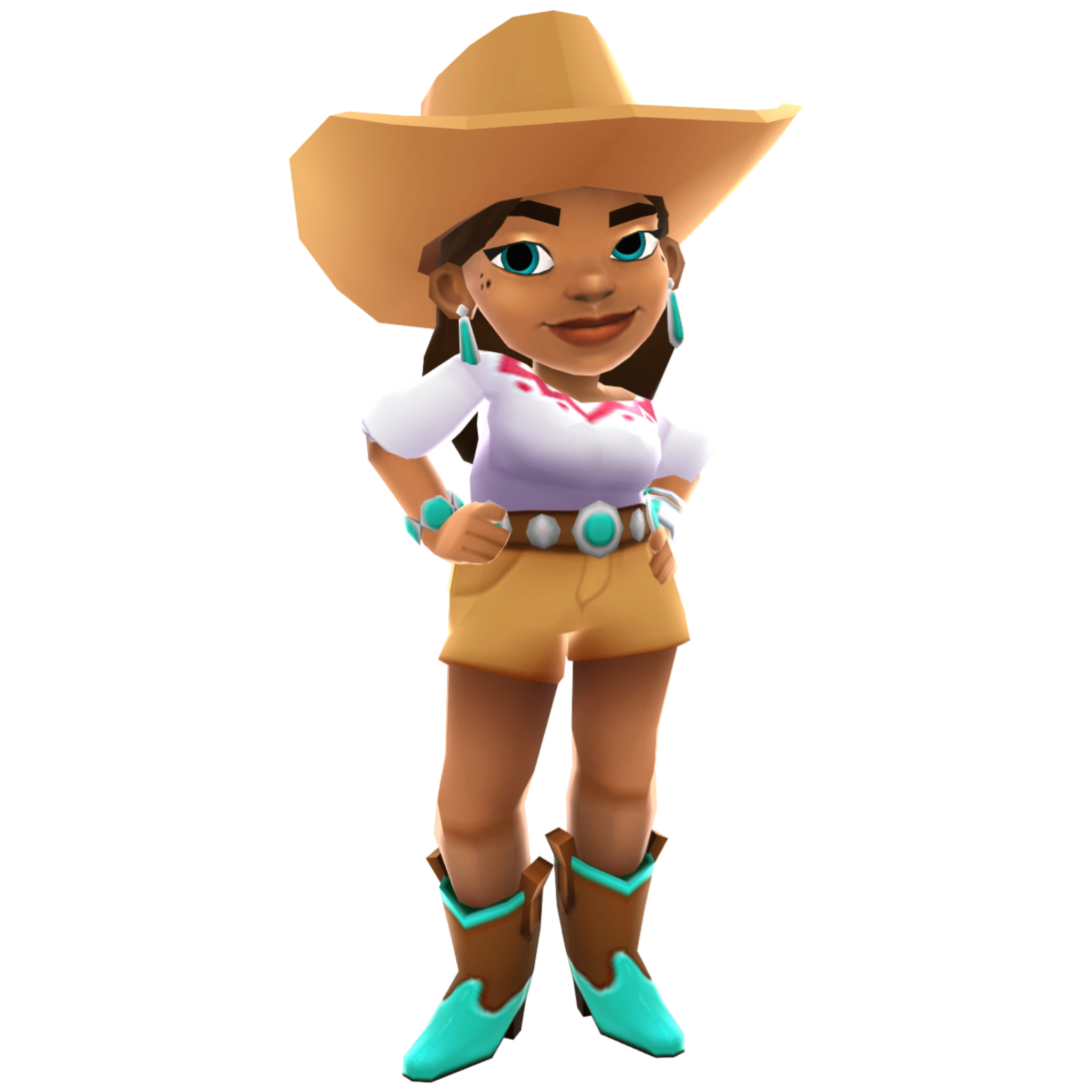 , she is a brown, long haired girl with light brown skin and a cowgirl hat. She wears blue earrings with brown/turquoise boots. She wears tan shorts with a brown, silver and turquoise belt. She wears a shirt with some sort of red pattern. She also wears blue bracelet on her right wrist, while a white and turquoise bracelet is on her left wrist. However, she isn't wearing pink lipstick.
