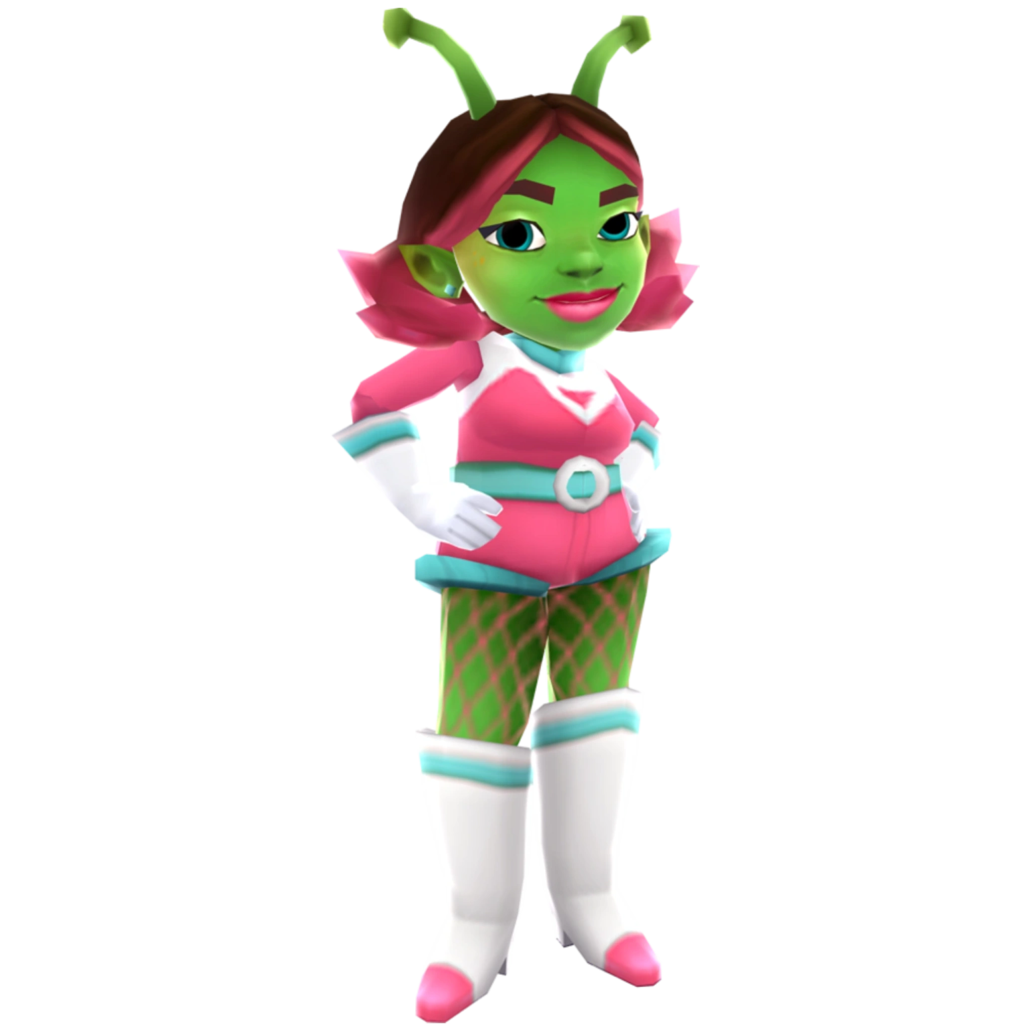 . She has blue eyes and brown hair with pink on the end with pink highlights. She wears a pink, white and blue tight-fitting suit, white gloves with blue rings on the end of them and white boots with blue rings on the top and pink ends. She also has pink lips and pink blush. She also has green antennas on her head.