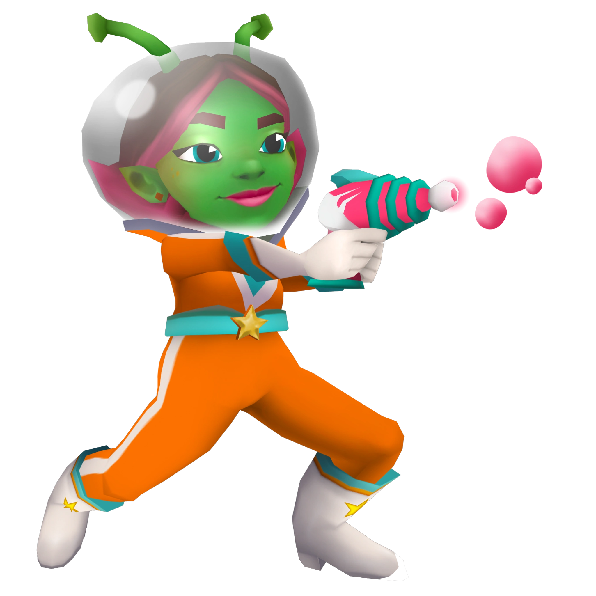 trailer. In her Space Outfit, she now wears an orange astronaut suit, a blue belt with a star and blue-cream boots with stars.