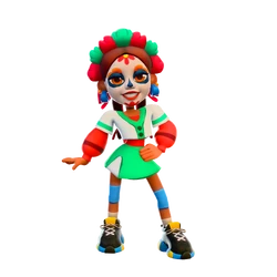 who wears a sugar skull makeup in honor of Dia de los Muertos. She also has a red and green themed outfit: from her rose headband, a cropped shirt layered on long-sleeved undershirt with wide sleeves, and short skirt. For her footwear, she has black shoes with white crisscross laces and yellow-blue accents, which matches with her blue knee pads. She has a pair of large blue, circular earrings for accessories.