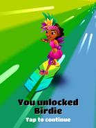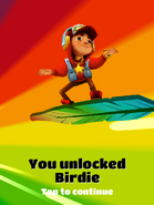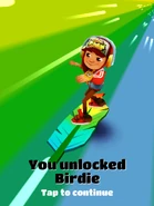 Birdie is the 29th limited hoverboard in Subway Surfers. Like any other hoverboard in the game, it protects you from crashing for 30 seconds. When crashed, it needs to recharge for 5 seconds before it can be used again. The board is a limited edition hoverboard, exclusive to