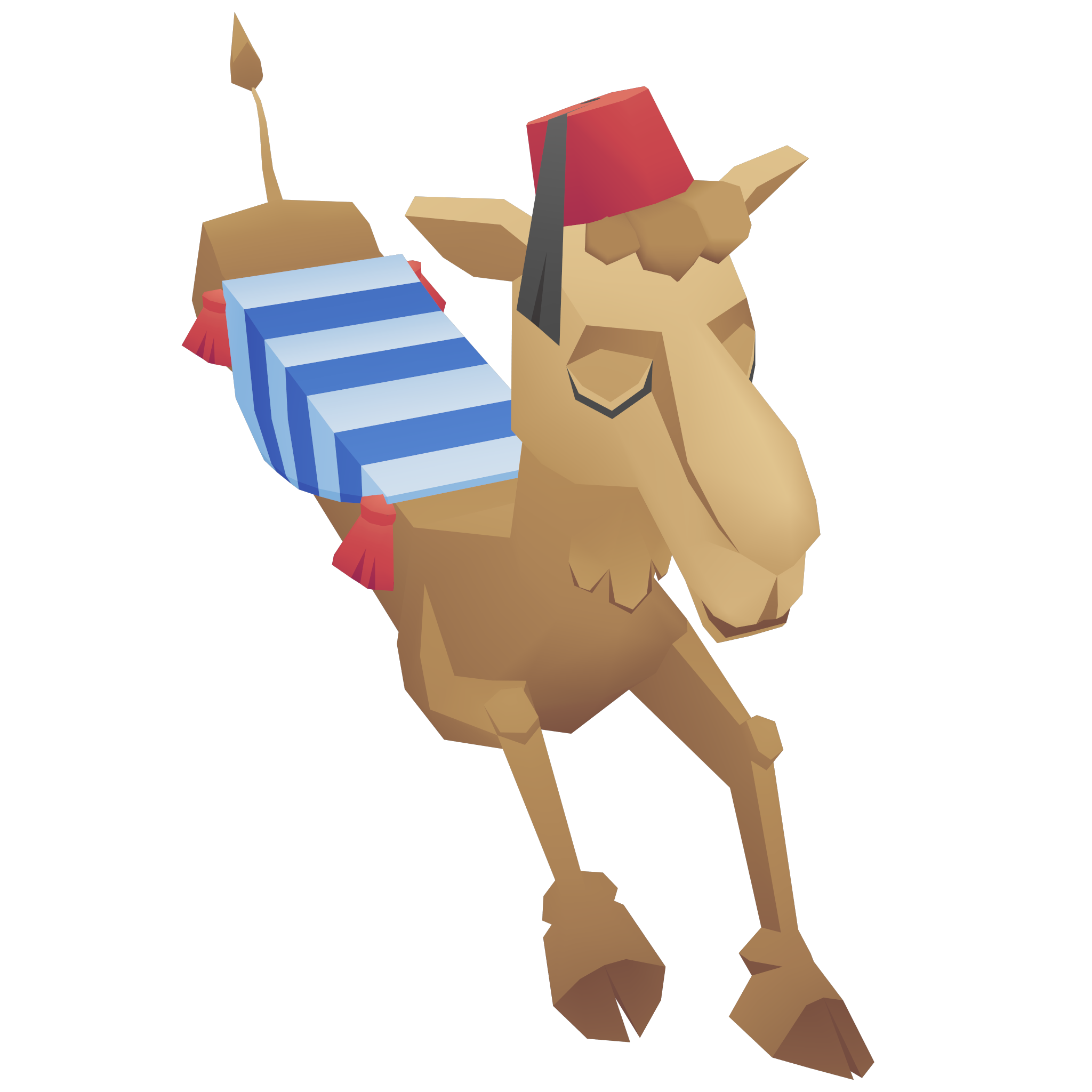 The camel board is shaped and looks like an actual camel, with a blue and white-striped saddle, wearing a Fez on its head.