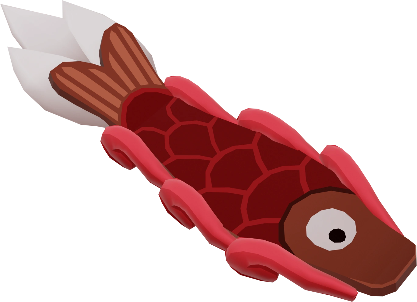 It has the appearance of a red fish, with a brown head with an eye and a brown-tinged tail at the end, followed by white feathers. At the bottom, there are green tubes from which the fire comes.