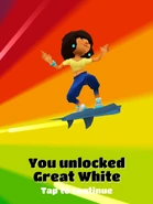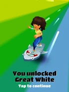 Great White is a non-limited hoverboard that protects you from crashing for 30 seconds. When crashed, the board will explode and recharge for a few seconds before it can be used again. It can be unlocked by purchasing it with