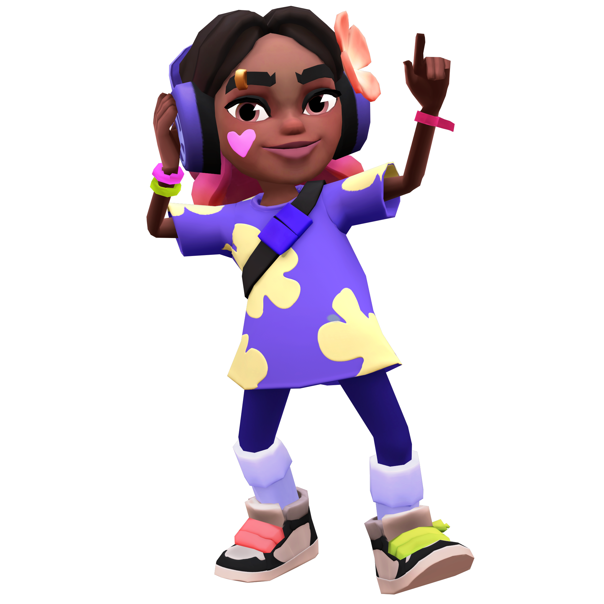 . She has hazel eyes and black hair with the tips being pink and two strands tied in a yellow ribbon, there is a coral flower in the front of her hair, and she wears purple headphones with the Rivals logo. She has a piercing on her right eyebrow and a heart on her cheek. On her right hand she has one bracelet pink and the other light green, on the left a raspberry ribbon. She wears a long purple t-shirt with pastel yellow flowers and dark blue pants, black with pink ribbon bumbag, long lavender socks and black and white sneakers, with salmon laces on her right and chartreuse laces on her left.