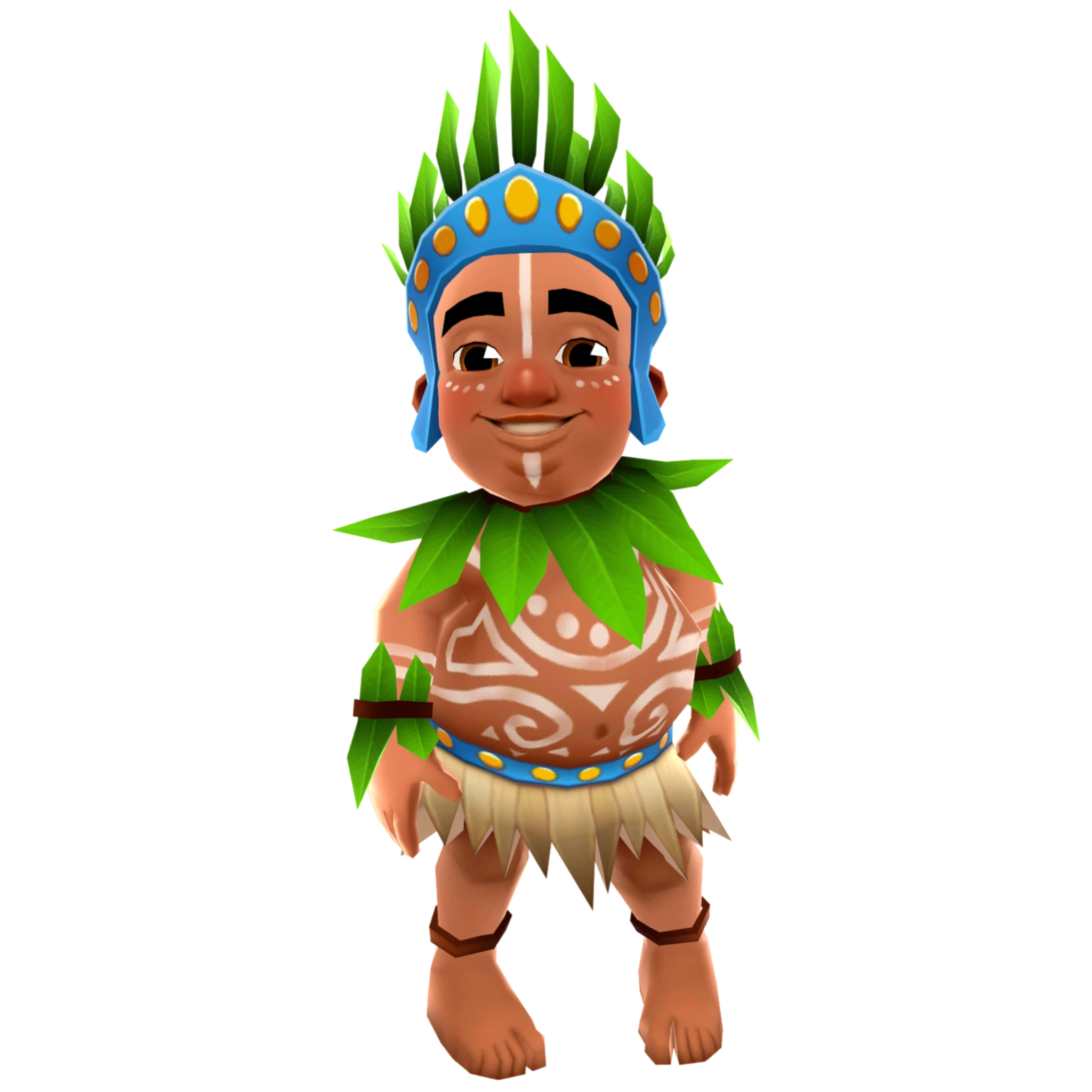 who wears a hula skirt, leaf wristbands and a grass crown on his head. He has tribal marking on his body. He has almost no clothes, and behind the crown hides a black Mohawk, which is shown in the Aloha outfit.
