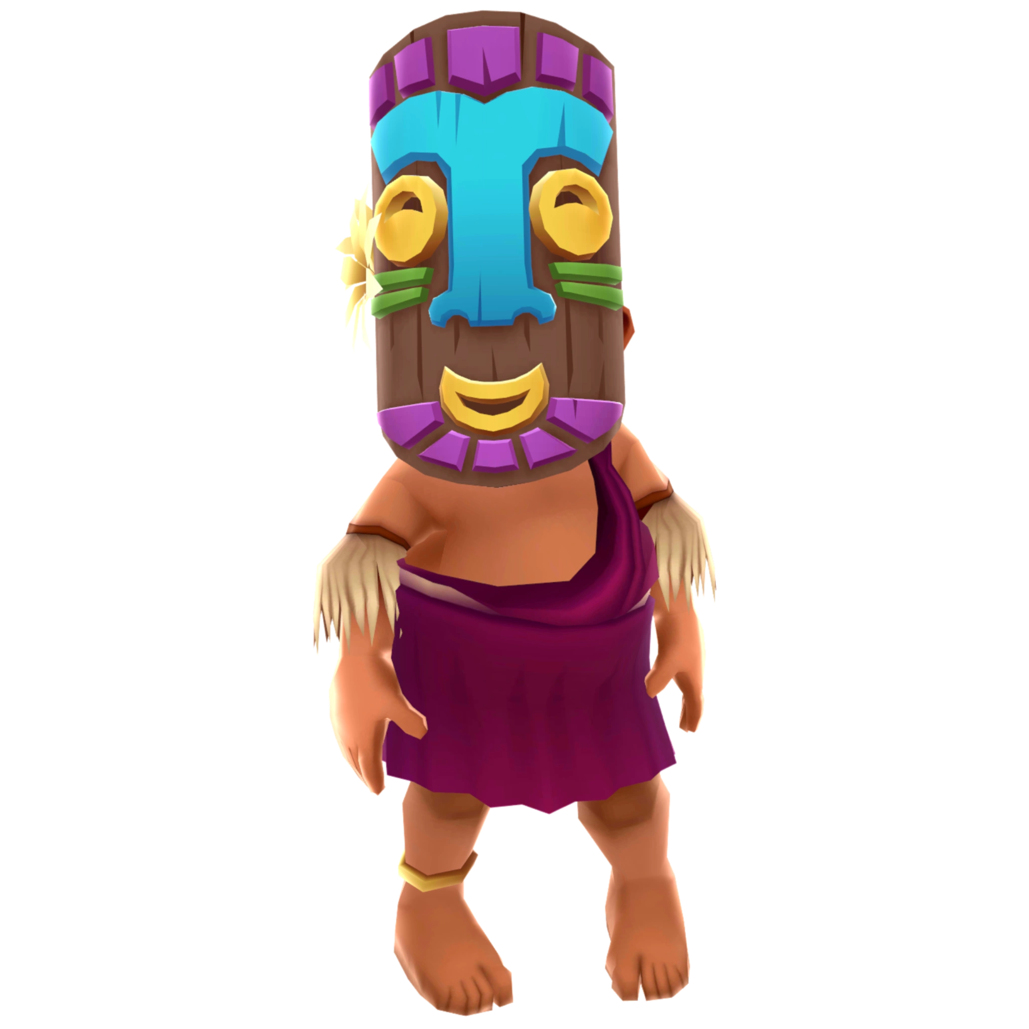 , his entire face is covered with a purple and blue tiki mask. A flower could be seen on the left side of the mask. He wears a burgundy dress and a ring on his left leg. His mohawk can still be seen.