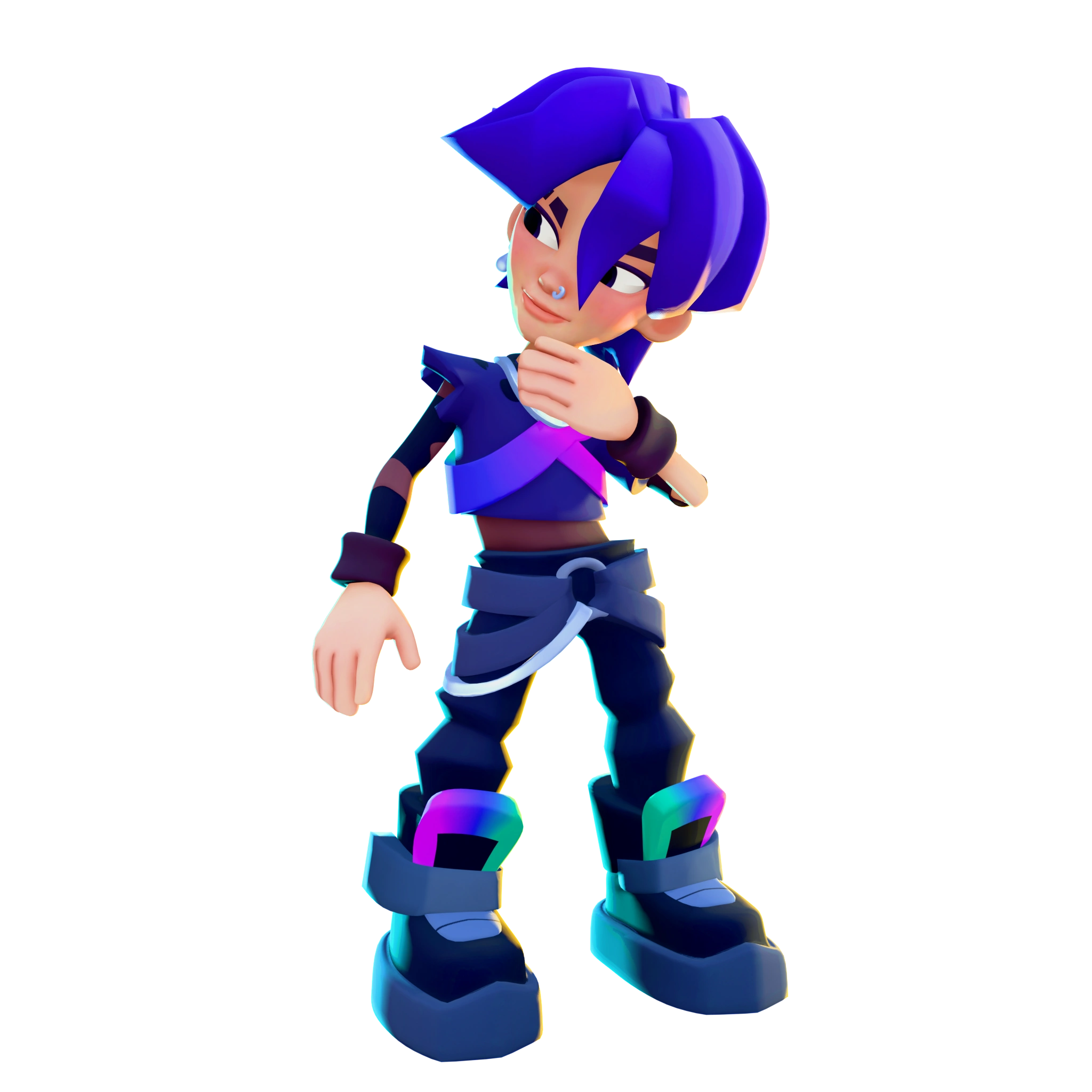 who is a member of the group R3VIVE. For his usual idol outfit, his navy blue hair is styled in a mullet and he wears a nose piercing. His blue sleeveless shirt is worn with a blue-pink gradient cross strap to match with his long, brown undersleeve and pair of wristbands. Meanwhile, his black pants is held by a chained belt, and he's also wearing a pair of black platform boots with blue, cyan, to purple gradient accents.