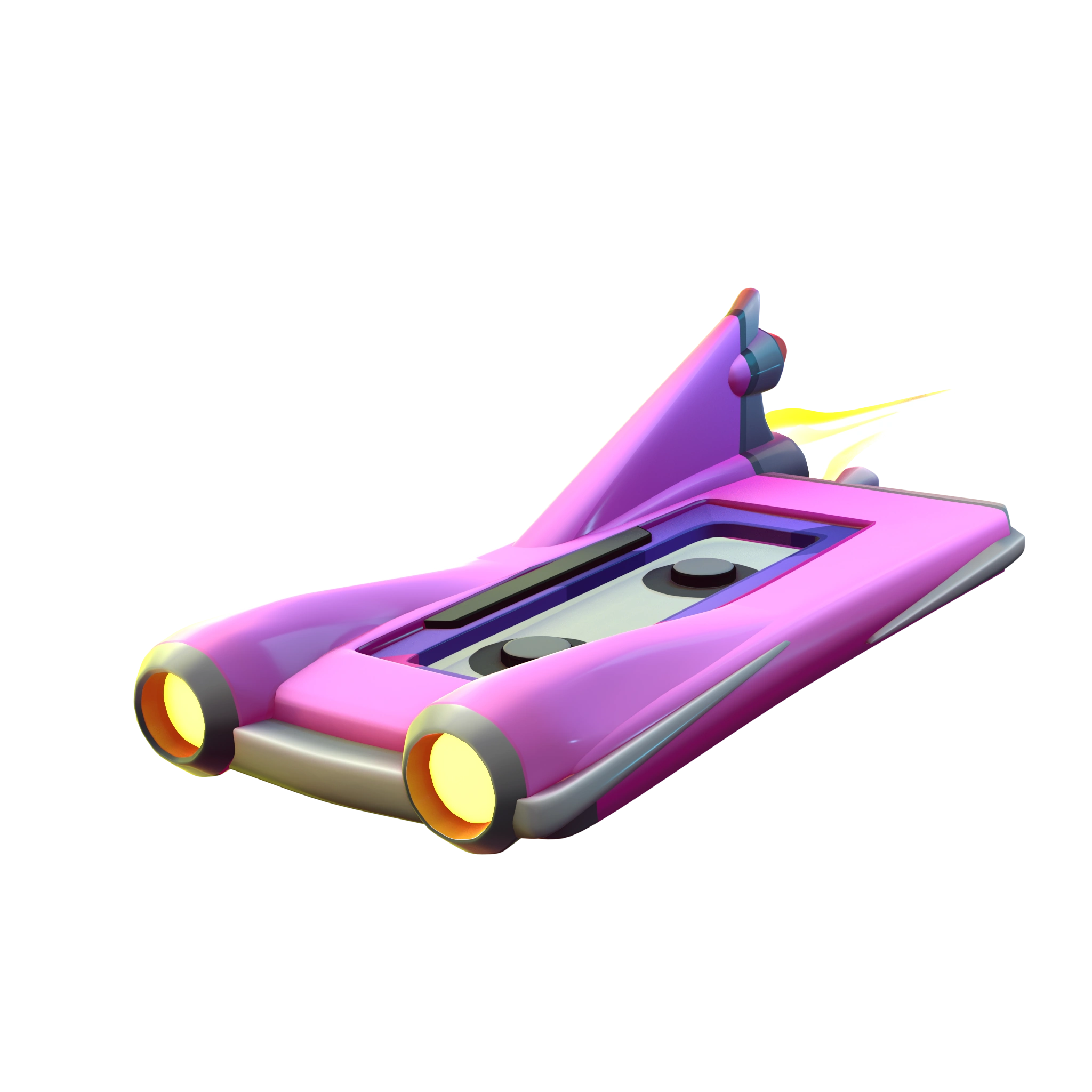 This board is shaped like a pink convertible designed with purple sound system on it, it has two exhaust pipes which emit flame and another one emit pink-note trail.