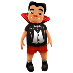 edition. He has a black cape and a black shirt. He isn't wearing his paper crown and has vampire teeth. The words on his shirt are also written in yellow. The rest looks like the default outfit. Starting from