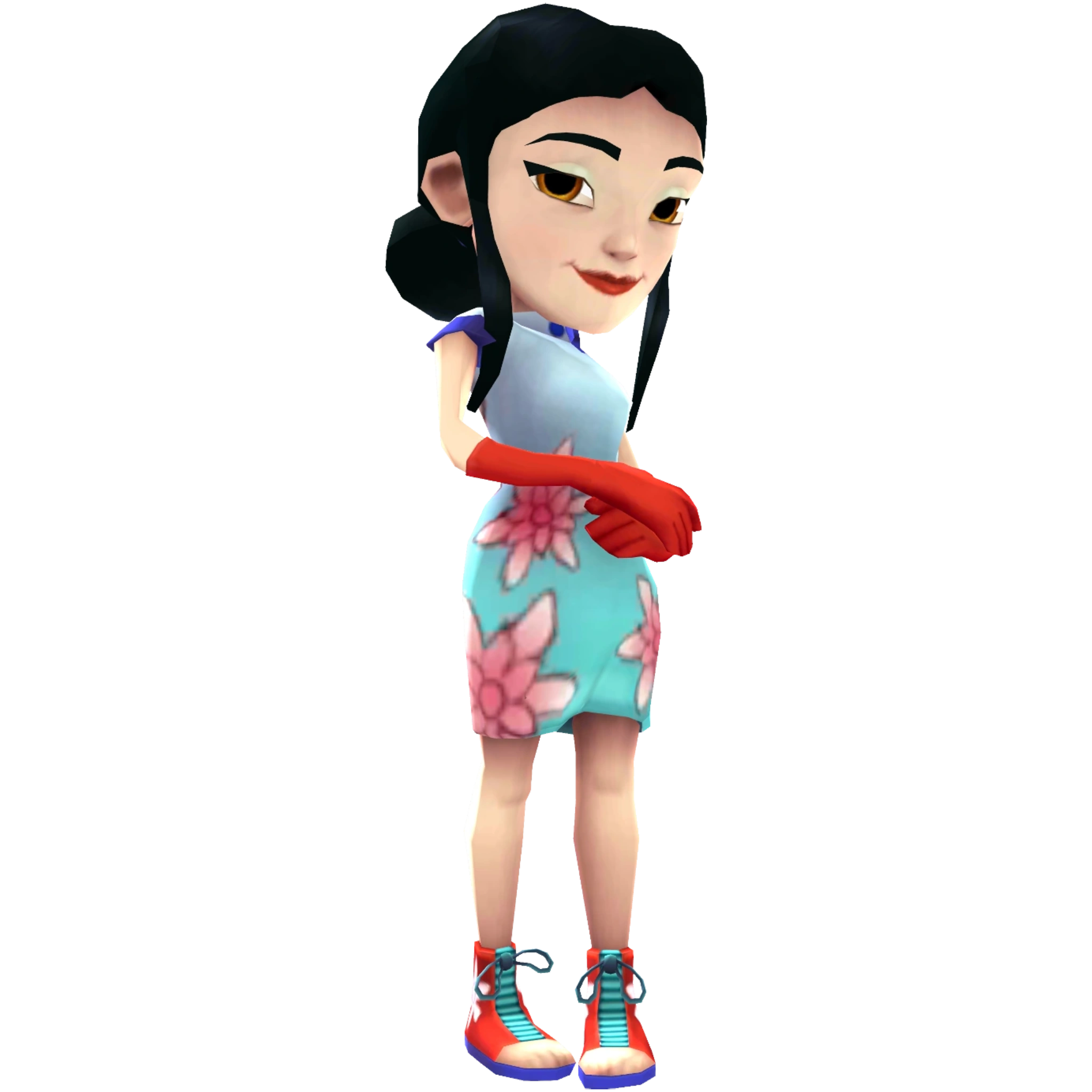 Ming’s original outfit is a traditional Chinese silk cheongsam dress in a cyan color with pink flowers and blue trim around the neck and arms. She accessories the dress with red elbow length gloves, lace-up red and teal ankle boots which are visible to her toes, with blue soles, to match the dress and gloves, and a red parasol. In this outfit she wears her hair in a simple ponytail, and wears mint green eyeshadow to match her dress, and red lipstick to match her gloves.