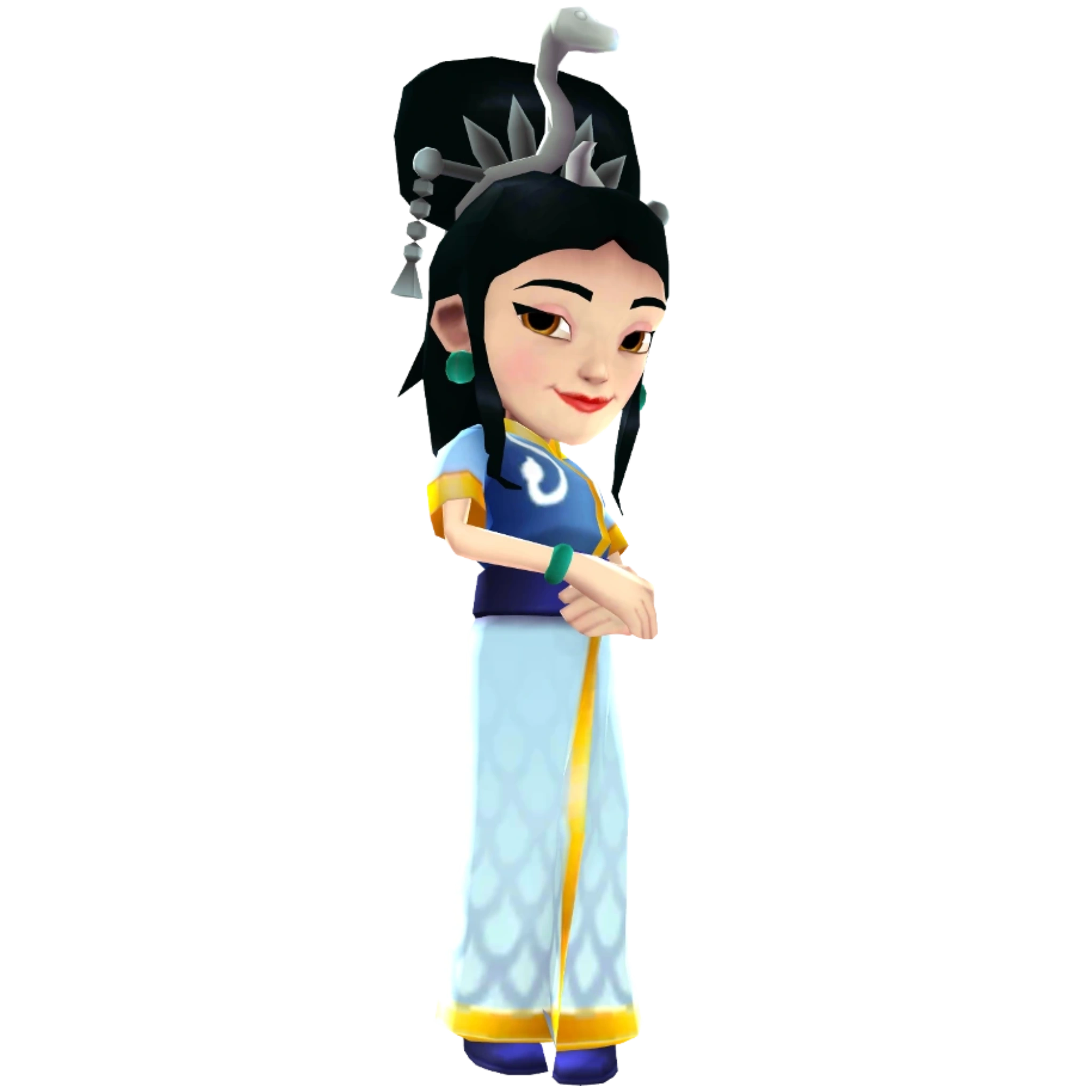 , she uses a empress outfit, with a long pale blue dress and a blue top with golden details and white snake designs, dark green earrings and wristbands, her hair is longer and tied in a big bun with a silver snake tiara and her umbrella that was red changes to light blue.