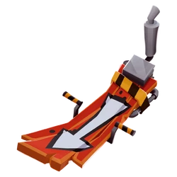 A brown to orange-y wooden hoverboard plank that has a white arrow in a black outline painted in the middle. It has a black and yellow-striped tape on the back, placed in front of the tall exhaust pipe. The pair of handlebars on its sides also has the warning stripes.