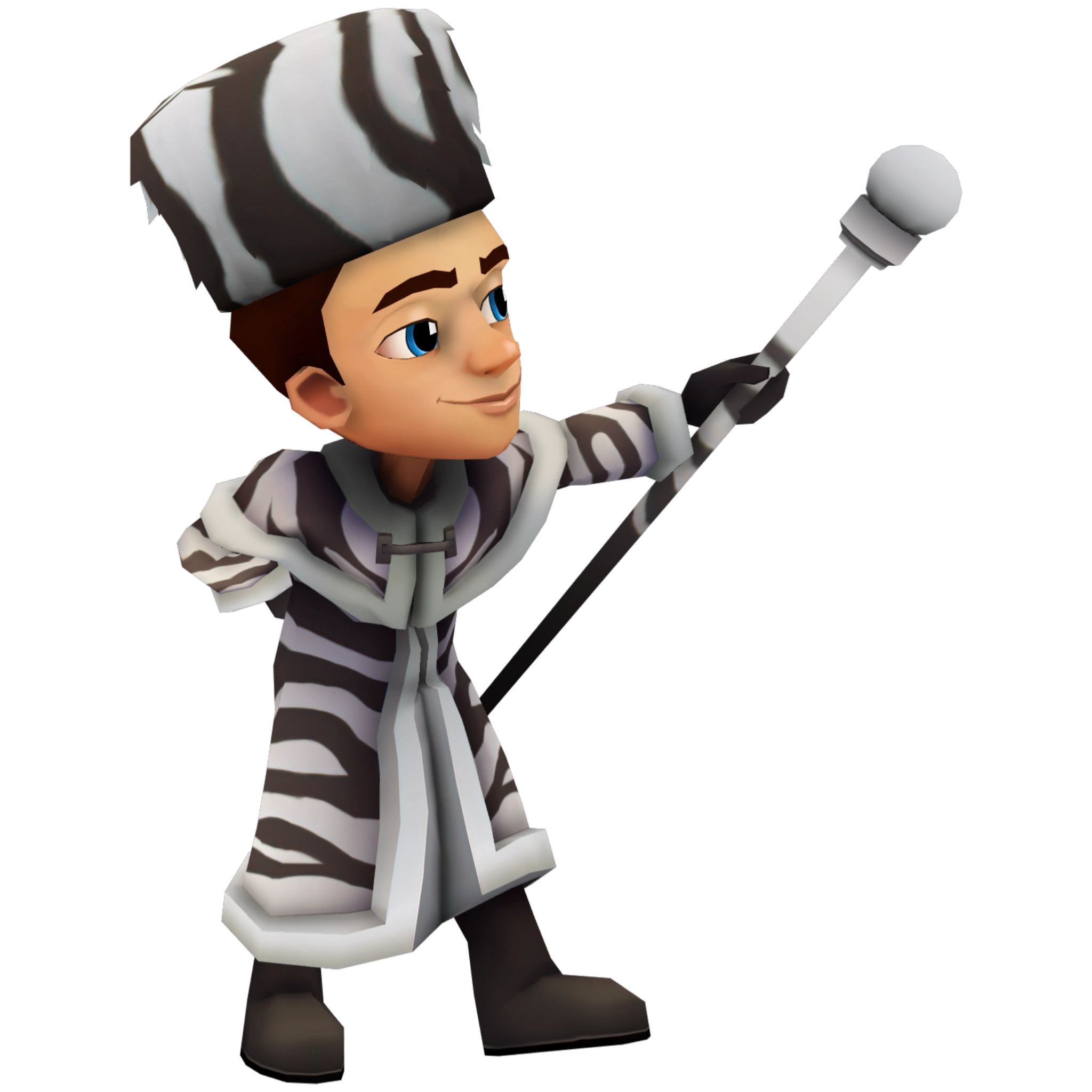 , in his Faux Fur outfit, he wears a fluffy zebra print hat, as well as a zebra print gown and black boots. He wears black gloves and holds a black and white rod.