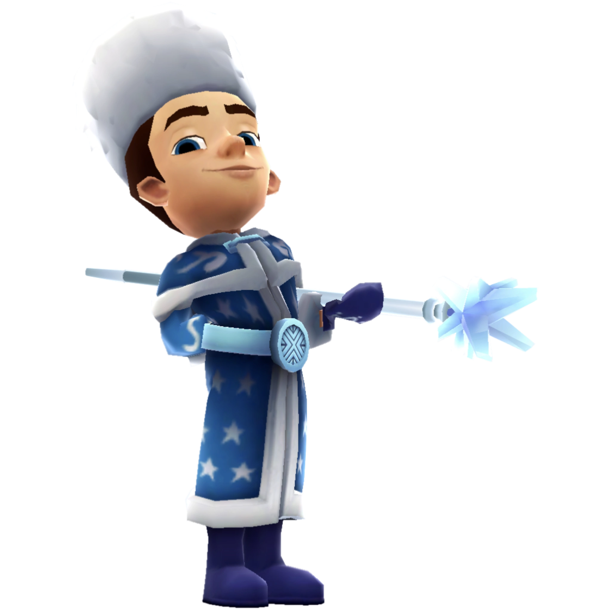 , he wears a white fluffy hat, a blue gown with stars and blue boots. He wears blue gloves and holds an ice staff.