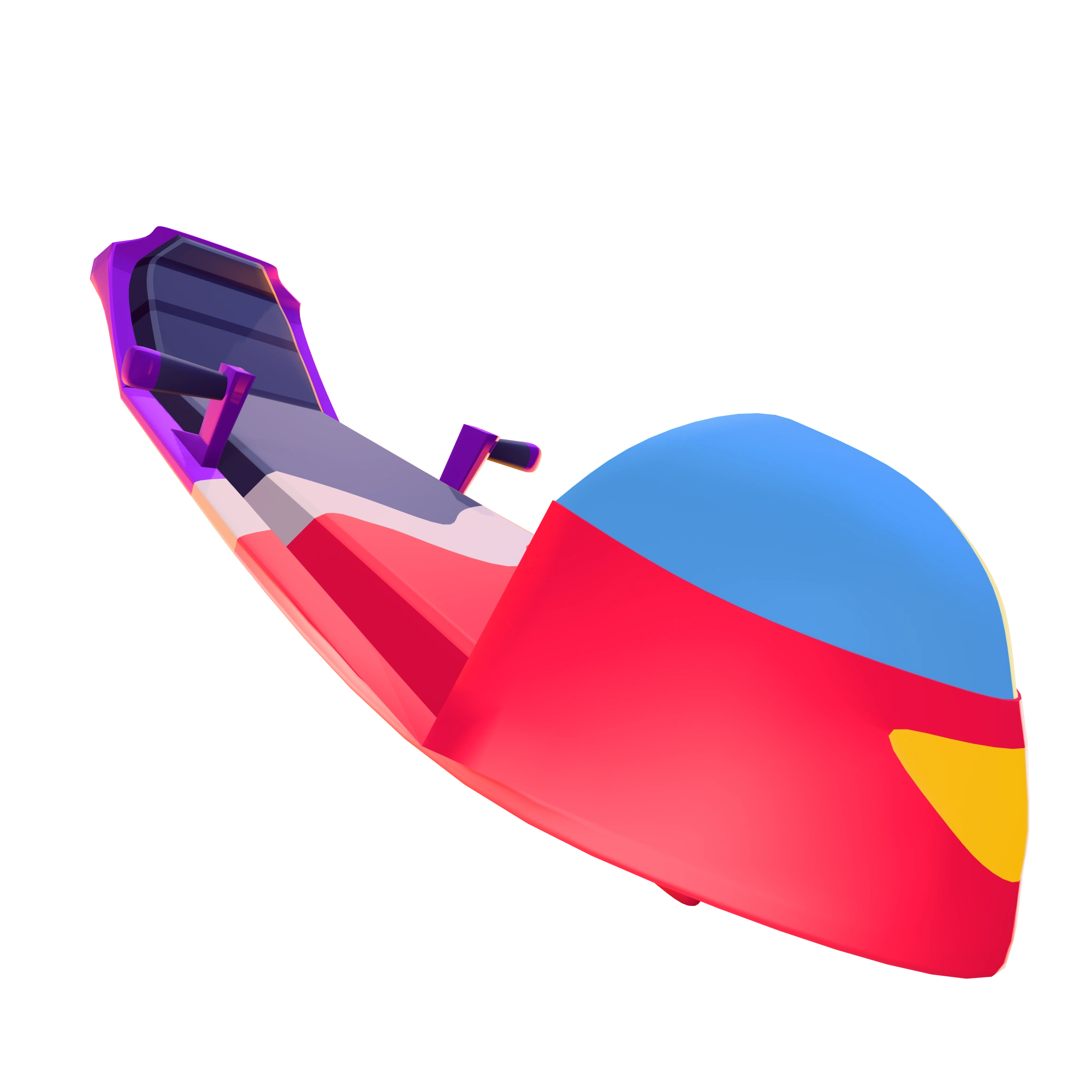 It's simply a pink motorbike with stay low ability, this board consists of purple, black and white colors, it has blue windshield, a pair of handlebars, curved seat in the back as the headrest, headlamp, and also auxiliary lamp in the back emiting red trails.