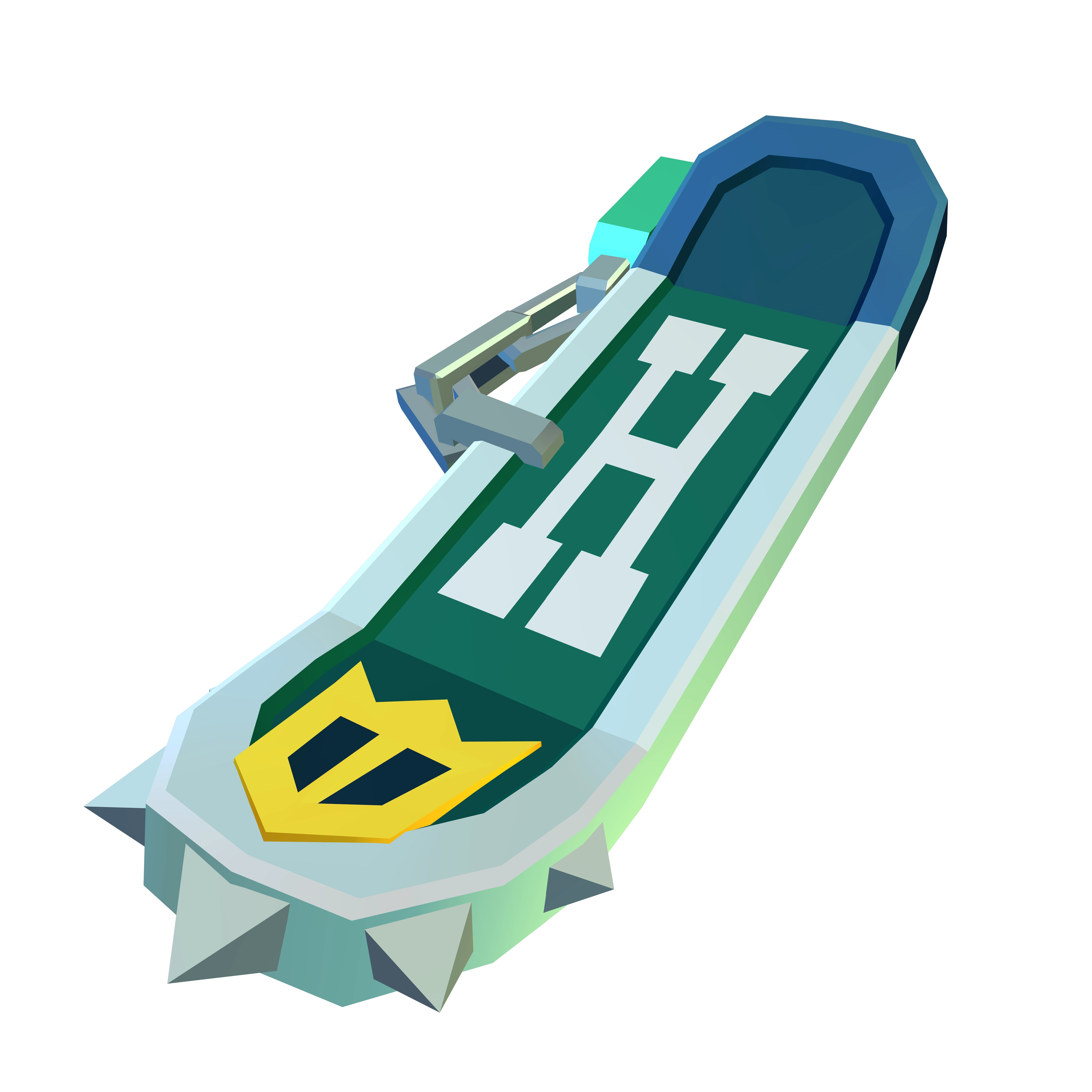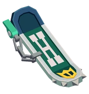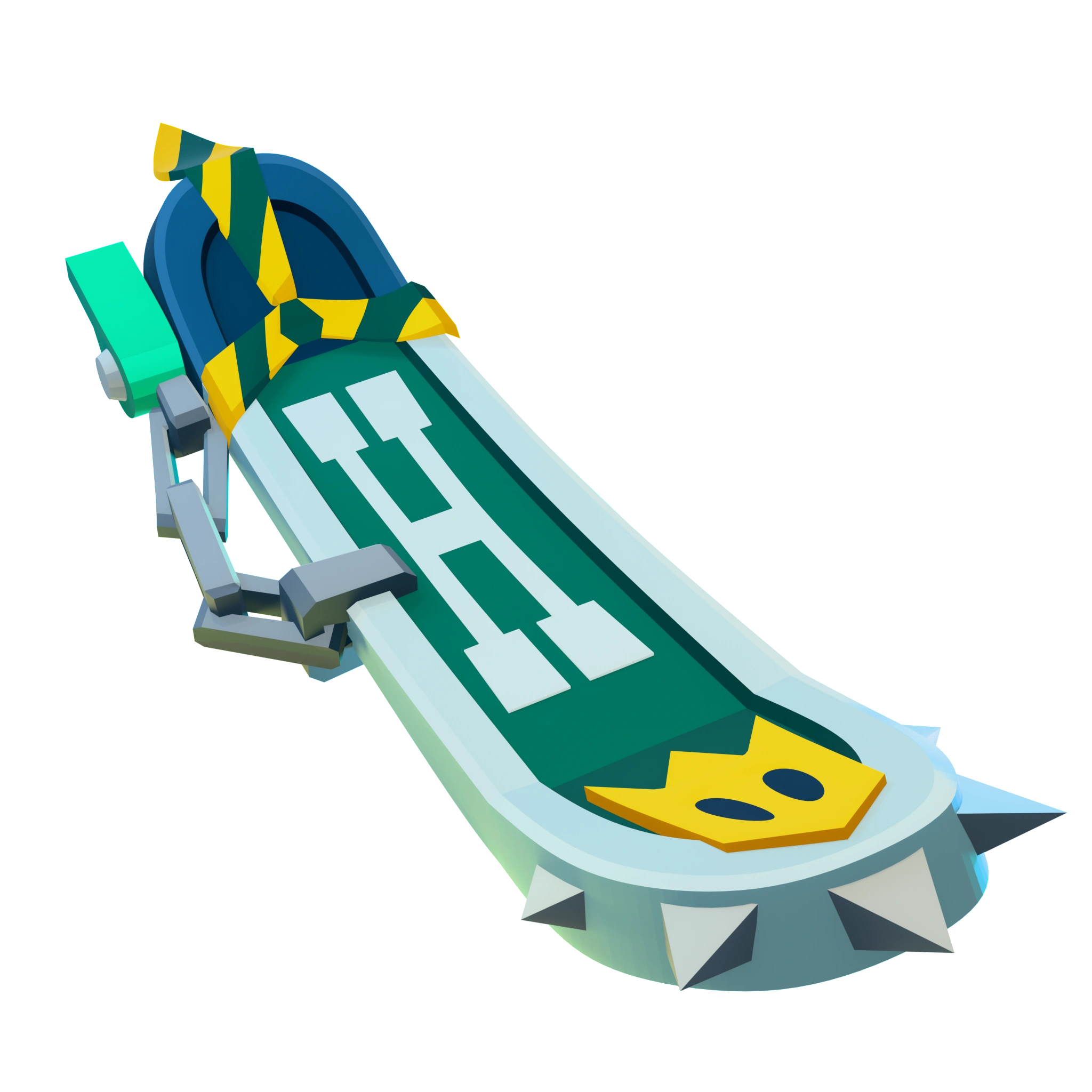 This is a dark green hoverboard that has a silver frame around it, with five spikes on the front and a chain on the right side. Its rear side is more darker and bluish green. For designs, it has a yellow crown with two green holes, an elongated, white "H" in Serif font, and lastly, a yellow and green striped tie strapped on the back.