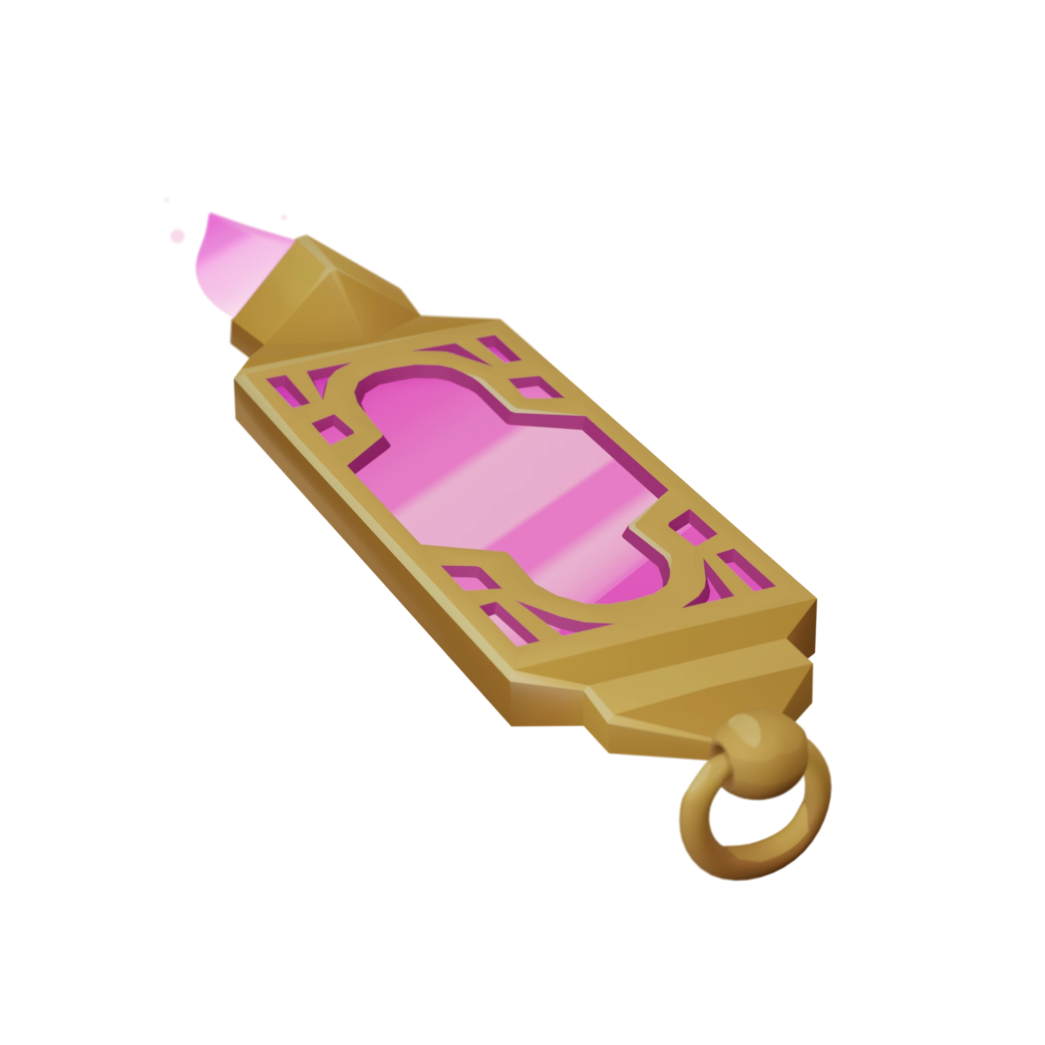 It takes the shape of a fanous (Ramadan lantern) with a golden metal frame, a hoop on top and a pink inside covered with golden patterns, there’s a golden bottom with a pink flame.