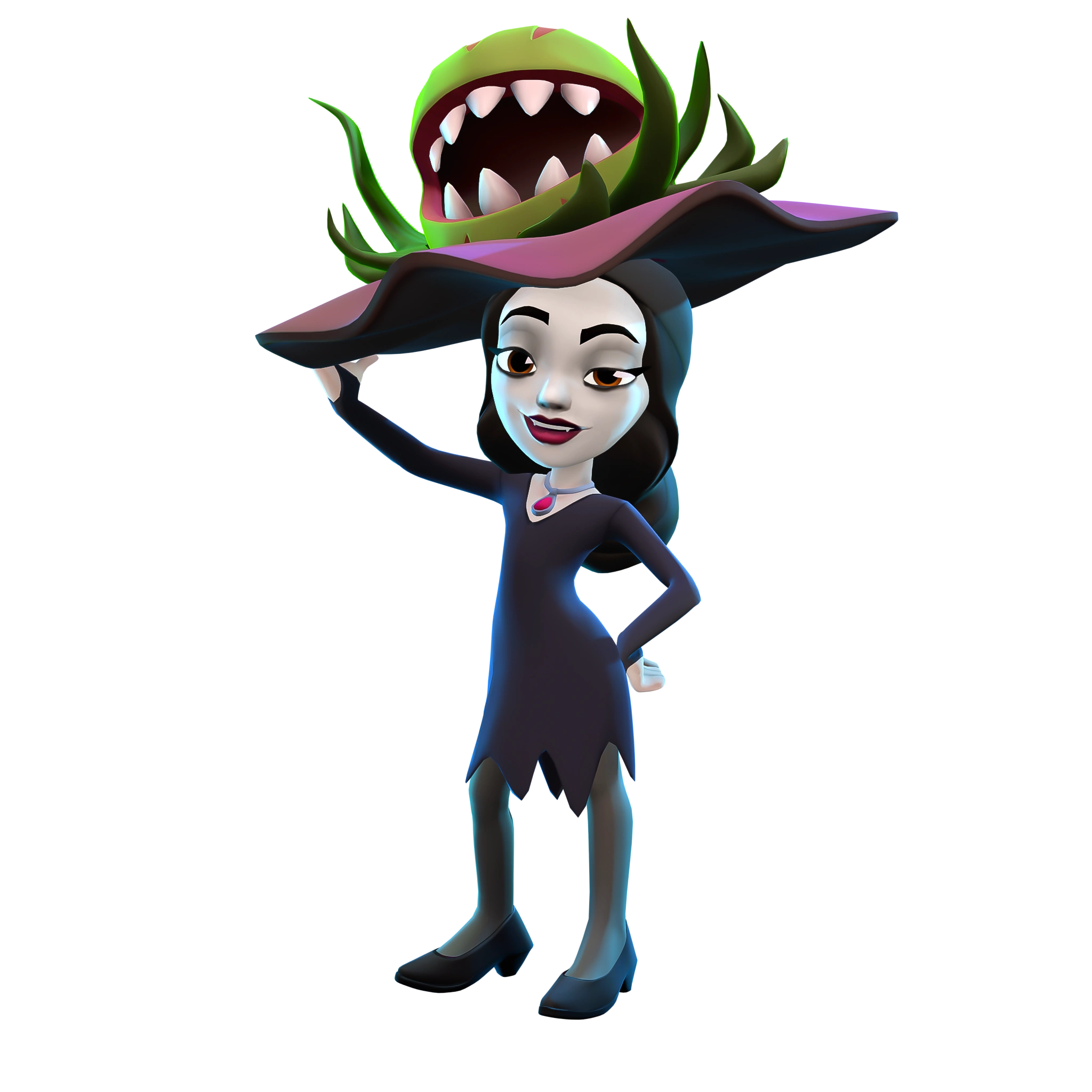 , her skin is now pale, her lips are painted in red lipstick, her eyes are now brown and her eyebrows are black, and she has a red diamond necklace around her neck. The hair is black and loose, on the head is a purple-black hat, and on top of it is a Plant-Monster, which has scary big teeth in the front and a big brown eye in the back. She is wearing a long black dress, which has slits at the end, and on her hands there is a ring with a red diamond on her index fingers. She has black tights on her legs, and she has black shoes on her feet.