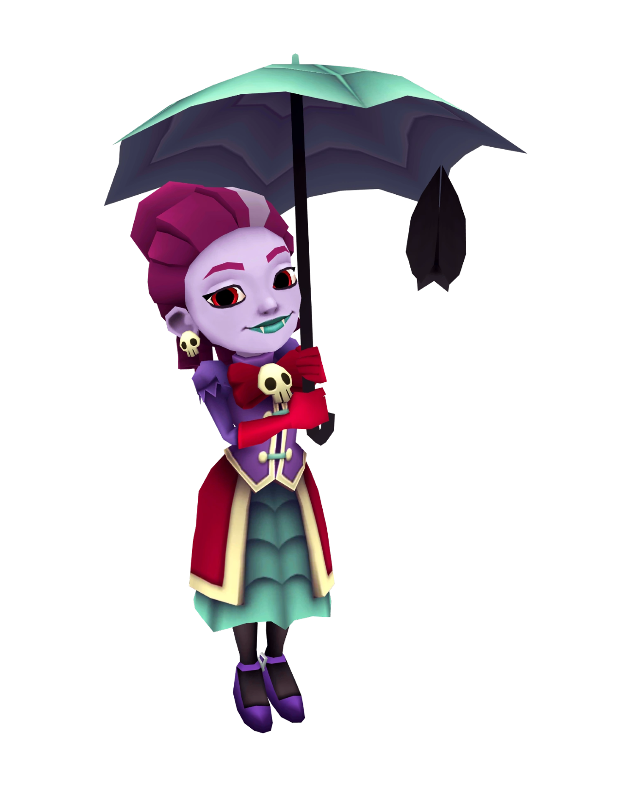 with plum red hair she wears up in a bun on the back of her head. Her face is a ghostly pale violet with seafoam green lips and clearly evident fangs; her eyebrows match her plum red hair. She wears a formal winter outfit consisting of a long sleeve purple corset jacket over a layered seafoam green skirt, and with a dark red over-skirt. The outfit is finished with a dark red bow at her neck held by a motif brooch. She wears skull earrings that match the brooch, as well as elbow-length red gloves; black tights; and purple heels. She carries a seafoam green umbrella which matches the color and style of her skirt. A bat hangs from the edge of her umbrella.