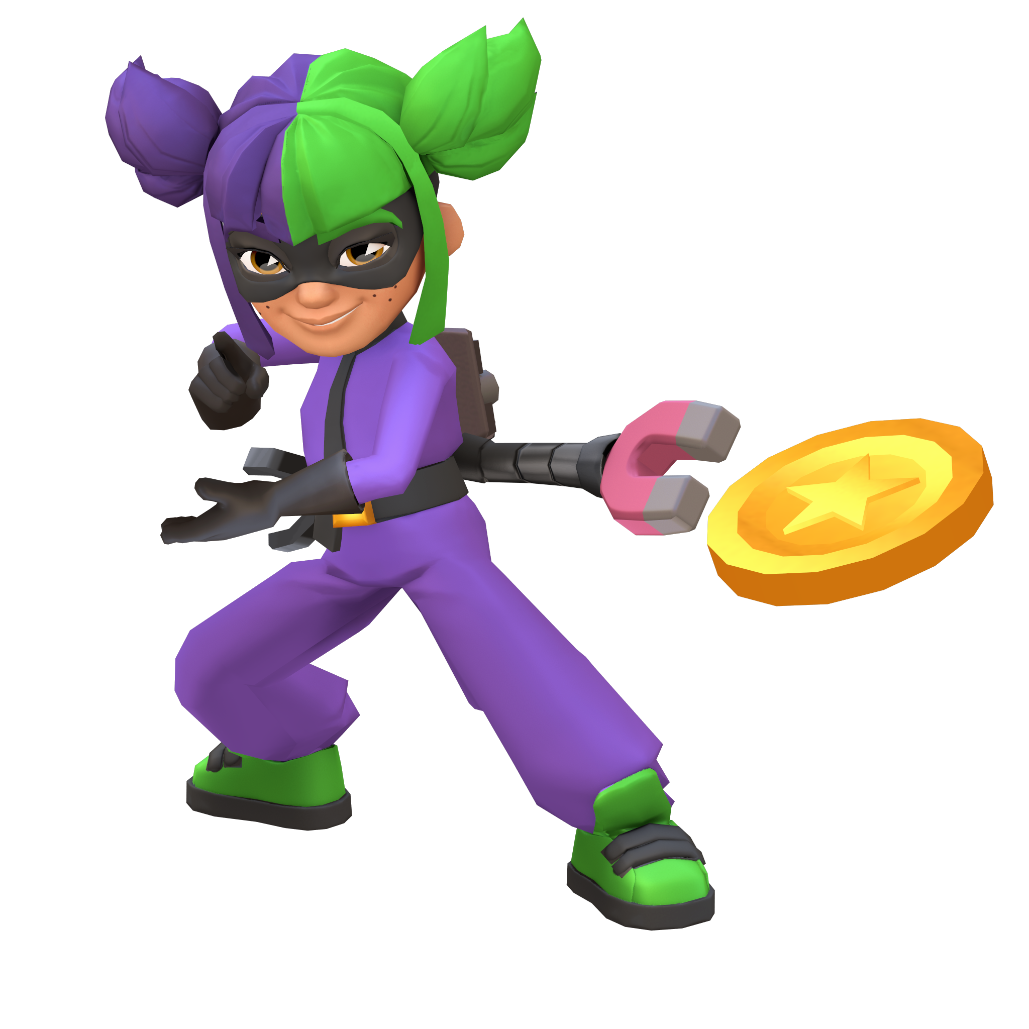 Yutani’s Super Runner outfit features a black domino mask, a purple coverall, a black utility belt with a golden buckle, black gloves, and green sneakers. A horseshoe magnet and a claw are attached to the rear of her belt. Yutani has a new hairstyle in this version, in which she dons space buns with two different colors on each side; purple on one half, and green on the other. Her eyebrows, too, are dyed purple and green.