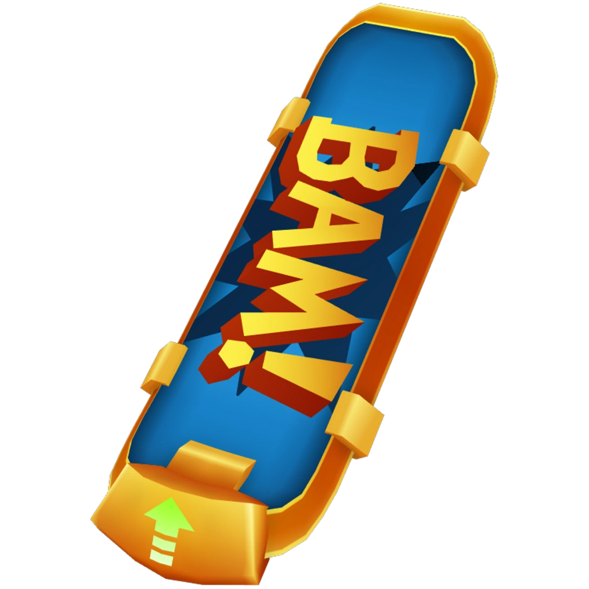 The board has the word "BAM!" on it in a yellow comic book font on a blue background with a yellow frame. With its first upgrade, it gains lighting bolts on the sides of it. With its second upgrade, it gains four small squares on the sides as well as a bumper on the front with this bumper having the same color and up arrow as the Super Sneakers.