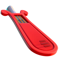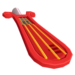 A red-colored hoverboard that has the shape of an elongated Lyre and an exhaust pipe on the back.