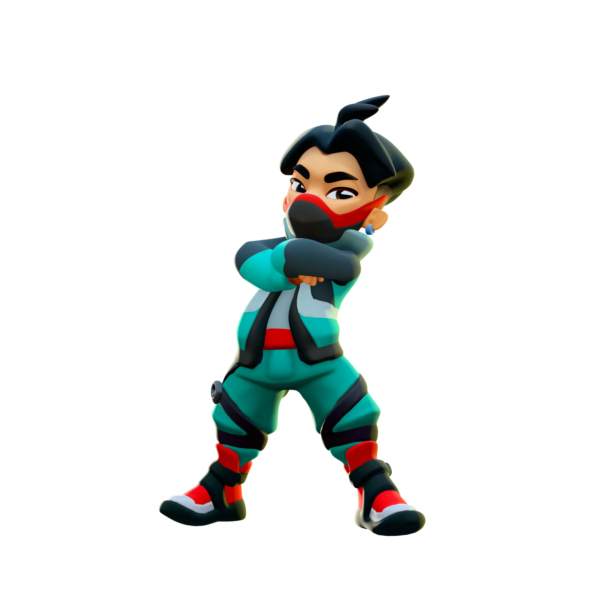 , his outfit is now mainly cyan and black. His shirt now has a red line at the bottom, he also has a red and black mask and shoes.